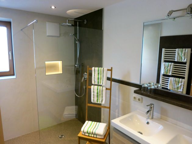 Neues modernes Badezimmer mit begehbarer Dusche und zusätzlicher Kopfbrause mit verschiedenen Wasserstrahlmöglichkeiten.