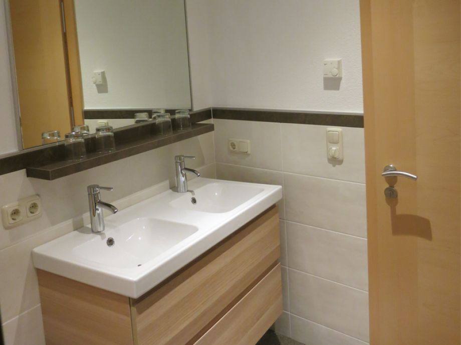 Doppelwaschtisch, Handtuchtrockner, Fenster und Fön.