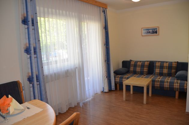 Die Ferienwohnung liegt im ersten Stock und bietet Ihnen eine Wohnküche mit einer bequemen Schlafcouch 1,5x2 m, TV Flachbildschirm, gratis W-Lan.