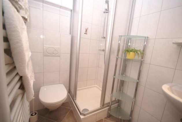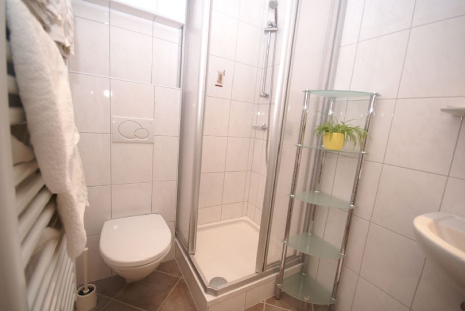 Kleiner Vorraum mit Garderobe. Bad mit Dusche, WC, Waschbecken und Haarfön.Dusch und Handtücher sind vorhanden