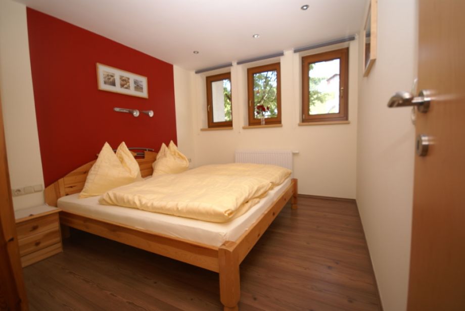 Ein Schlafzimmer mit Doppelbett inkl. Bettwäsche und offenem Fußende.
